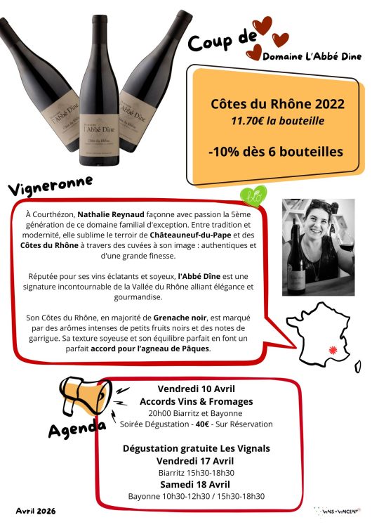 🍇Zoom sur le Domaine L’AbbĂ© Dine et l’agenda des Ă©vĂ©nements d’avril 2026 des Vins de Vincent.🍇